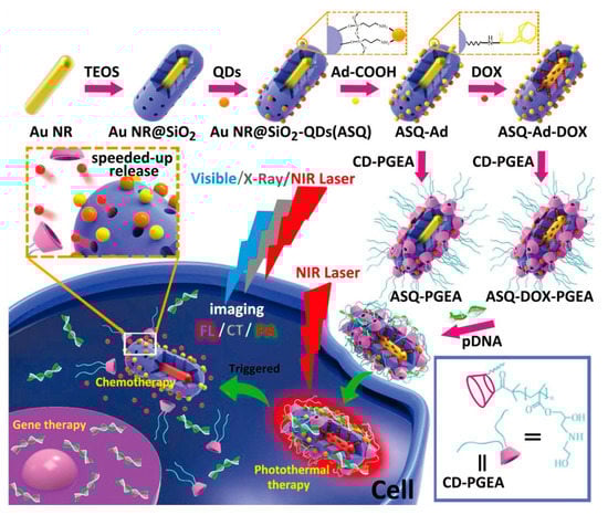 Duan et al. designed a multimodal imaging-guided combination therapy system based on Au NRs [66]. The researchers first coated the Au NRs with mesoporous silica for loading of drug and quantum dots, and further decorated the system with adamantyl (Ad) groups and two-armed ethanolamine-modified poly(glycidyl methacrylate) with cyclodextrin cores (CD–PGEA) conjugates as gatekeeper (Figure 3). Additionally, pDNA was condensed to the surface of the nanostructure for gene therapy. The obtained ASQ-DOX-PGEA2-p53 (Au NRs@SiO2-QDs (quantum dots)/DOX (doxorubicin)-Ad/CD-PGEA2/p53) nanoplatform was designed to serve as modality for fluorescent imaging, CT imaging, as well as PAI, with the additional advantageous photothermal properties to effectively inhibit glioma tumor growth with application of NIR. Furthermore, the heat generated by Au NRs under NIR irradiation reduced the supramolecular interactions between Au and CD-PGEA, thereby opening the pore gate and leading to subsequent release of pDNA and DOX encapsulated in the mesoporous silica layer. Such multifunctional nanoparticles, integrating An NRs, silica layers, QDs, and CD-PGEA as one structure, leveraged the advantages of each component to realize precise imaging-guided gene/chemo/photothermal triple-combination therapy of cancer. Besides coating Au NRs with mesoporous silica, Huang et al. designed a “yolk-shell” structure, incorporating a “non-contact” porous magnetic nanoshell on Au NRs functioning as both the drug container and magnetic resonance imaging (MRI) agent [67]. Under the guidance of PAI and MRI, the drug carriers were magnetically guided to the tumor site with on-demand drug release triggered by pH/NIR. The synergistic chemo-photothermal therapy was shown to be effective in eradiating and suppressing recurrence of 4T1 tumor in mice.