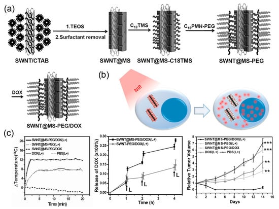 - Liu, J.; Wang, C.; Wang, X.; Wang, X.; Cheng, L.; Li, Y.; Liu, Z. Mesoporous Silica Coated Single-Walled Carbon Nanotubes as a Multifunctional Light-Responsive Platform for Cancer Combination Therapy. Adv. Funct. Mater. 2015, 25, 384–392. [Google Scholar] [CrossRef]