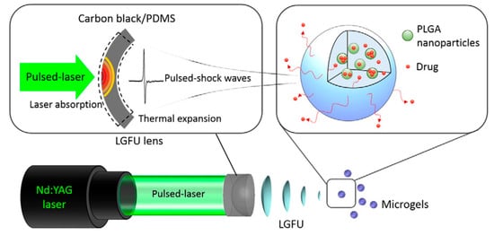 With the assistance of a transducer that comprised of a laser absorption layer (carbon nanotube) and a thermal expansion layer (polydimethylsiloxane), pulsed laser can be transmitted to high frequency ultrasound [112]. The Gu and Jiang groups utilized laser-generated-focused ultrasound (LGFU) to trigger drug release from the microgel (Figure 5) [36]. Compared to traditional ultrasound triggered drug delivery systems, LGFU showed higher resolution and reduced heating effect to normal tissue. Anticancer drug DOX and antibacterial drug ciprofloxacin were encapsulated in PLGA nanoparticles, after which the PLGA nanoparticles were further embedded into alginate microgel. A significantly enhanced release of drug was observed at the focal spot after application of LGFU by the cavitation effect. The researchers further validated that this LGFU-triggered delivery device could be leveraged to provide spatiotemporally controlled release for in vitro antitumor and antibacterial treatment.