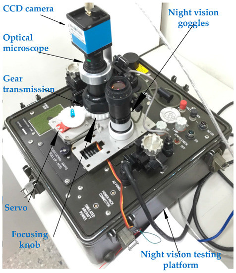 An optical microscope (Computer M0814-MP2, CBC Americas, Cary, NC, USA) with CCD (DFK 41BU02, Imaging Source, Charlotte, NC, USA) detection was used in this study. The CCD camera had a size of 50.6 mm × 50.6 mm × 50 mm and weight of 265 g. The image dimensions were 1280 × 960 pixels with a pixel size of 18.6 μm and a focal length of 8 mm. A DC servo driver (S03Q3, Grand Wing Servo-Tech Co., Ltd., Upland, NY, USA) was used to rotate the focusing knob of the NVGs. The servo controller was implemented using an Arduino Mega 2560 board (Smart Projects, Olivetti, Italy), which generates pulse width modulation (PWM) signals of 0.9–2.1 ms for ±60° movement range of the servomotor. The resulting system is shown in Figure 1, where a fixed mechanism is used to fix the camera on the NVGs and a servo transmission mechanism is implemented to adjust the focal length of the NVGs.
