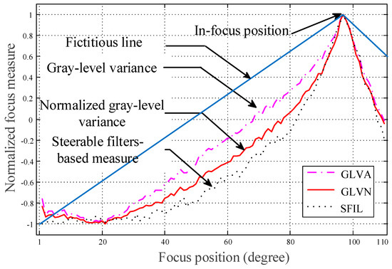 The optimal sharpness calculation methods can be categorized as the typical depth from focus (DFF) or depth from defocus (DFD) methods. DFD is commonly used in depth estimation and scene reconstruction. This method has relatively few calculation samples, which improves servomotor efficiency at the expense of accuracy degradation [19]. Due to noise in the image, stability, and precision need to be considered simultaneously. This study followed the similar sharpness calculations proposed by Pertuz et al. [20].