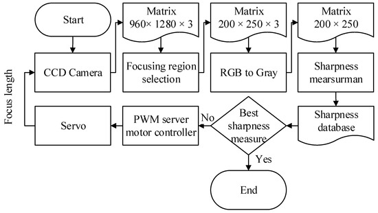 The required focus length of the NVGs on the testing platform is adjusted by a servomotor driven by a microprocessor Arduino Mega 2560 board. The focal length can then be tuned such that the best sharpness is obtained. The complete passive auto-focusing process is described in Figure 4. Firstly, a single image is captured from a CCD camera, where a region of interest is selected with the size of 200 × 250 × 3 pixels. The interested image is transformed in to a gray one and then the corresponding sharpness is calculated. Once the best sharpness is attained, the procedure is finished. Otherwise, the focus length is going to be further modified via a servo motor for the next iteration.