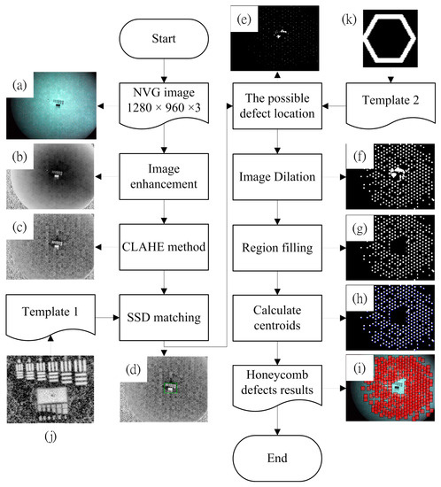 (a–k) Automatic honeycomb defect detection process.