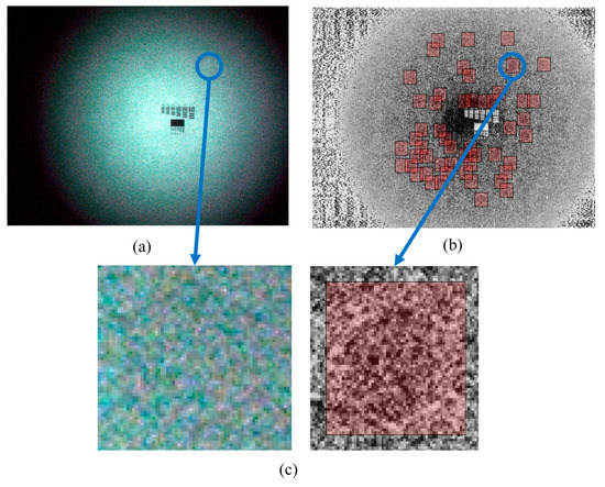 - The contrast limited adaptive histogram equalization (CLAHE) method [26] is introduced to process the correlation between the pixel locations and the other gray level pixels. An increased contrast ratio is achieved and the defect regions are accentuated, as shown in Figure 5c.