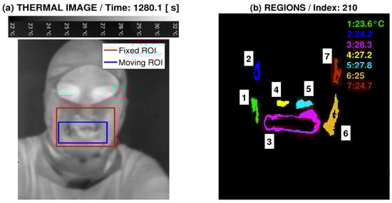 Data acquisition presenting (a) specification of the fixed and moving region of interest (ROI); (b) facial regions of different mean temperatures in the selected thermal image frame.
