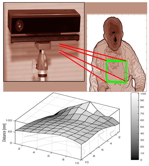 An alternative approach to breathing data acquisition using an MS Kinect depth sensor is presented in Figure 3. For the selected thorax area, the depth sensing camera evaluates a matrix whose values indicate the distances of the individual pixels from the depth sensor. A videosequence of such frames can be used to determine the time evolution of chest movements in selected regions.