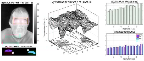Facial temperature values are useful for detection of neurological disorders and facial symmetry analysis. The time stability and precision of the thermal camera was tested for a sequence of images recorded with a sampling period of 5 s in the face area with a stable temperature distribution over a short period of time for a healthy individual. The area around the eyes illustrated in Figure 4a was selected and the area of the regions in the selected temperature range of 26–28 °C presented in Figure 4c was analysed. The results in Figure 4d,e enjoy a precision better than 7% related to the mean temperature, which is sufficient for the given case.