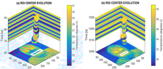 Figure 1 presents the general principle of the use of the thermal imaging camera [] to detect temperature changes in the mouth area for the analysis of breathing. The calibration bar associated with each video frame is presented in the upper part of Figure 1a, showing the temperatures and associated image grey levels. Figure 1a presents the fixed ROI and the current position of the moving ROI as well. The recorded videosequence of temperature changes can then be used to analyse the time evolution of the temperature in the selected region of interest (ROI).