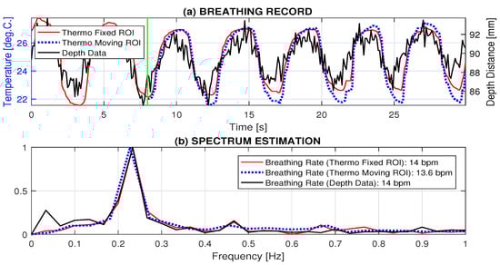Figure 6b presents the comparison of the breathing frequencies estimated from the spectral components evaluated for signals recorded both by the thermal imaging camera (using the fixed and moving ROI) and the MS Kinect depth sensor. All frequencies detected by this algorithm are the same for the given frequency resolution.