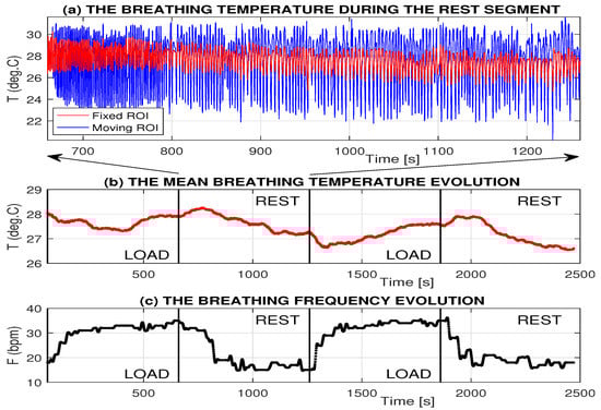 Both thermal imaging and motion data can be used for monitoring of the breathing rate during physical activity. The proposed method of adaptive specification of the breathing area and temperature range recognition was applied for the analysis of the evolution of the breathing features recorded during physical exercise and in the following resting time period. Figure 7 presents the breathing temperatures recorded by the thermal imaging camera in the selected time range and the corresponding evolution of mean temperatures and breathing frequency evaluated in time windows 60 s long. Figure 7a presents the evolution of mean temperatures in the fixed and moving mouth area showing wider temperature ranges for the moving ROI (specified in Table 2). The moving ROI position results in more robust detection of temperature changes allowing to follow motion of the head. Regression coefficients for the set of exercises 30 min long performed at room temperature and evaluated for the subsequent restful period of 7 min are summarized in Table 3. The resulting mean regression coefficients are −0.16 °C/min. and −0.72 bpm in the given case. These results correspond with the physiological explanation of breathing changes.