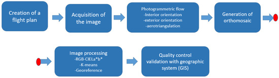 In order to obtain a good result in the image processing, a set of processing steps must be carried out [35]. Currently, in the market, there are a variety of photogrammetric software packages that can perform processes on the UAV images. These packages usually use an algorithm called structure from motion that is a set of techniques of photogrammetry and computer vision [41]. In our case, we use the software called Inpho UAS Master 6.0 (Trimble Inc, Sunnyvale, CA, USA) [42] and the application ExifTool that allows to read the metadata of a variety of photographic formats [43].