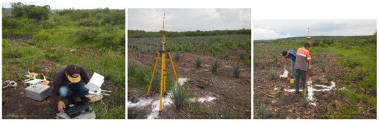 The UAV flight plan was checked in advance via Google Earth (Google Inc-DigitalGlobe 2016, Mountain View, CA, USA), the take-off and landing area were specified. The flight time was about 15 min. We performed flight at different altitudes between 40 mts and 100 mts. The flight of the UAV allowed us to obtain the collection of images and their approximate coordinates. It is known that the conditions of the area, weather and the global positioning system generate errors in the image. For this reason, geodetic control points (GCPs) were distributed in the region of interest using the differential GPS.