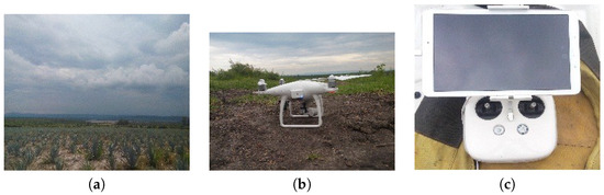 Low cost equipment and field work in selected study areas. (a) Agave crop area; (b) Unmanned Aerial Vehicle, (UAV); (c) Remote Controller.