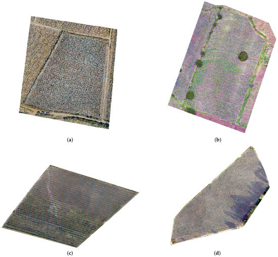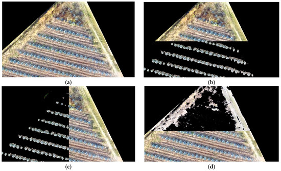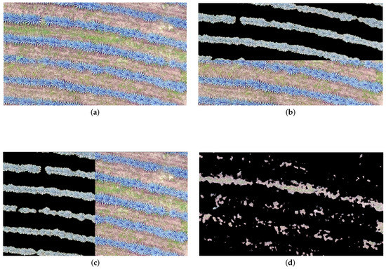 Detection of agave plants and weed corresponding to the study area c Described in Section 2.2: (a) Original ortho-mosaic; (b) Agave detection bottom–top; (c) Agave detection left–right; and (d) Detected weed.