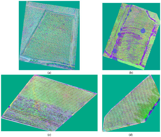 In Figure 8, an example of the results of classification through k-means is depicted. The image represented in Figure 8 a,b corresponds to regions located in study areas b and c, indicated in Figure 3.