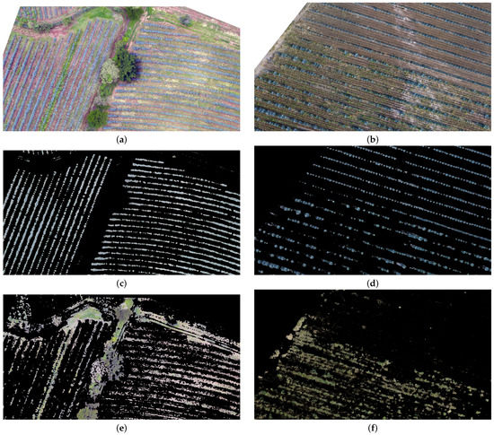 Example of classification results by k-means. (a) Image sample of the study area b; (b) Image sample of the study area c; (c) Detected agave plants in the sample represented in panel (a); (d) Detected agave plants in the image represented in panel (b); (e) Detected weeds in the sample represented in panel (a); (f) Detected weeds in the image represented in panel (b).
