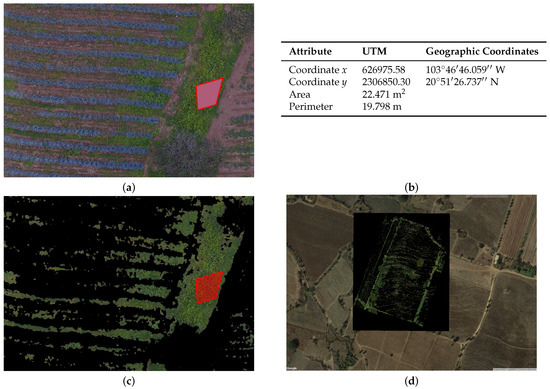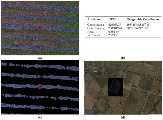 (a) position of agave plants in the QGIS system; (b) table with the object attributes described by QGIS; (c) sample of detected plants; and (d) full study area b described in Section 2.2, plants’ segmentation, shown in Google earth.