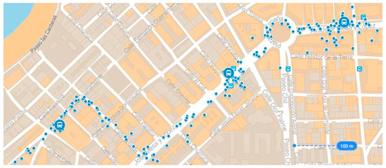 A second cause of error is the propagation medium, i.e., refraction in the ionosphere and troposphere, and errors produced by the same signal reaching the receiver by two or more different paths because it has bounced off buildings or natural elements; this error is called multipath error. A final cause of error in position data is due to errors in the GPS receivers. Our proposed system uses conventional GPS receivers installed in vehicles, and the accuracy of the data that they provide depends on the satellite constellation that they are able to view at the time that the position and geometry of the constellation is calculated. In an ideal scenario, with constellations of more than 7 satellites an accuracy of less than 2 m can be obtained. Given the different sources of error in the GPS coordinates, in the case of public transport vehicles, multipath errors are particularly relevant, especially when the vehicles run through urban areas. Considering the above explanation of GPS, the user accuracy depends on a combination of satellite geometry, URE, and local factors such as signal blockage, atmospheric conditions, and receiver design features/quality, adopting our system a maximum possible error in position data of 25 m, taking into account that the SIS URE Accuracy is behind 13 m during normal operations at any AOD and the metioned external factors (atmospheric conditions, multipath, technical manufacturer specifications, …); henceforth this maximum error will be represented by E. Figure 1 is a map illustrating the position data captured by public transport buses that follow a route in an urban area. The blue dots represent the position data, and we can see that some of these coordinates stray from the road because of GPS data errors.
