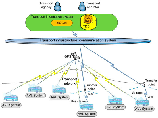The system primarily uses four resources that are usually employed in regular public passenger transport by road: GPS vehicle tracking system, the computing and storage systems used in vehicles to record and monitor the activities carried out on board, the communications system used to transfer data between the head office and the vehicles, and the transport database (TDB). The system consists of two modules: the AVL Module (AVLM) deployed on the vehicles and the Service Quality Control Module (SQCM) deployed at the operator’s or transport agency’s data processing centre. The AVLM continuously records and automatically transfers the vehicle’s position. The SQCM evaluates the quality of service by calculating the punctuality and regularity metrics for the planned services. Figure 2 provides an overview of the system.