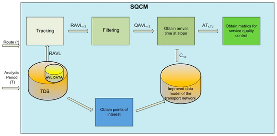 Based on specification of the part of the transport network to be analysed—i.e., a stop, a route, a set of line services, etc.—and the temporal aspects of the analysis, this module obtains the data and parameters required for quality control. The SQCM, as shown in Figure 3, is executed in four steps: the first step, tracking, consists of obtaining the initial set of position data that will be used for quality control; the second step, filtering, ensures that quality control will be carried out using an integral data set, selecting reliable position data to that end; the aim of the third step is to obtain the passing times for each of the stops on the line services analysed; and finally, the fourth step consists of calculating the metrics used for quality control.