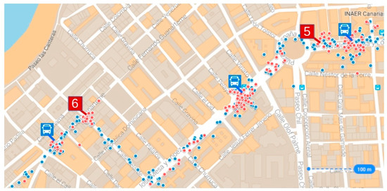Figure 5 illustrates a real-life result for this classification technique applied to the route studied in this article. It shows a map of part of the route with the position data, represented by blue and red dots, and the positions of two centroids of stationary data clusters, the red icons labelled with numbers 5 and 6, acquired during the analysed line services. Three stops on the route are identified by blue bus icons. The red dots represent GPS readings with zero horizontal velocity used by the classification technique to identify centroids of stationary data clusters.