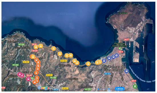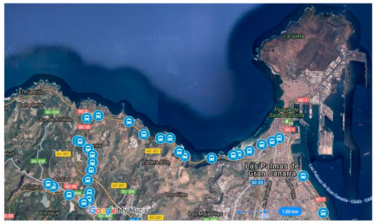 Currently the system described in this article is in operation at the public transport company, Global Salcai-Utinsa S.A. This company is based on the island of Gran Canaria (Canary Islands, Spain), has a fleet of 345 vehicles, and operates 127 different routes on a transport network that contains 2686 stops. In 2015, this company carried out an average of 2395 line services on all routes, covering 28,897,002 km and carrying 19,284,378 passengers in that year. The system has been integrated with the other components used by this company on its onboard systems and its communications systems. The quality control results obtained for one of its routes are described below. The route itself is 23 km long, starts in the city of Las Palmas and ends in the city of Arucas; it has 30 stops, and it begins in an urban area in the city of Las Palmas, until the sixth stop, after which it becomes an intercity route, until the last four stops, where it again becomes an urban route through the town of Arucas. The company uses the code 210 to identify the route; therefore in the formalisation developed for this article, r = 210. Figure 6 gives an aerial view of the route with the stops represented by bus icons.