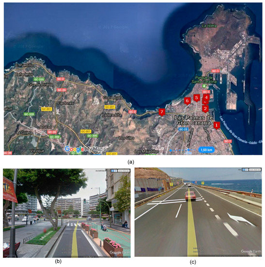 The results were obtained during period T—the whole of 2015—therefore in our formalisation it will be indicated as follows: T = 2015. Route 210 was scheduled by timetable during the analysed period. The AVL system recorded 51,499,404 position readings during all the line services completed for this route. The number of vehicles involved in these line services for the seleted route was 166, being 16 the number of vehicles that carried out these services systematically. In the preliminary analysis of the route to detect systematic stopping points that are not stops on the route, 7 such points were identified. Figure 7a displays these points as numbered red icons. These points are the centroids of a set of stationary vehicle data. Figure 7b,c are photographs of two of these points. Figure 7b corresponds to point number 5; this is a systematic stop point because the road on which the vehicle is travelling is a bus lane ending in a roundabout, and entry into the roundabout is controlled by a traffic light. Figure 7c is a photograph of point number 7; this is a point where the vehicle stops because it is on a slip road (right lane) that joins a dual carriageway (left lanes) and does not have right-of-way.