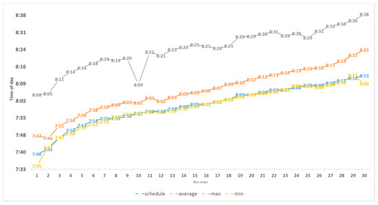Once the GPS data had been filtered, we obtained the arrival times at each stop on each line service. The timetables of the line services on this route are scheduled by passing time, with two day types: one the one hand, weekdays (Monday to Friday), and on the other hand, weekends and public holidays. The results correspond to the two types: first, the results for weekday line services starting at 07:40 a.m., and then the earliest Sunday service, which starts at 8:40 a.m. Figure 8 shows the arrival times at each stop for the first set of line services, those that run from Monday to Friday. The horizontal axis represents the stops in order, i.e., the value 1 is associated with the first stop on the route, 2 with the second and so on until the last stop of the route, which has the value 30. The blue line represents the scheduled passing time, the average passing time is represented by the orange line, the earliest passing time by the yellow line, and the latest passing time by the grey line.