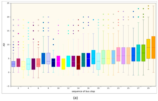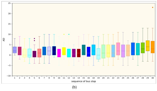 Box-and-whisker plots showing median values for the AD metric at each of the stops on the route for line services that run from 07:40 from Monday to Friday (plot (a)) and from 08:40 on Sunday (plot (b)).