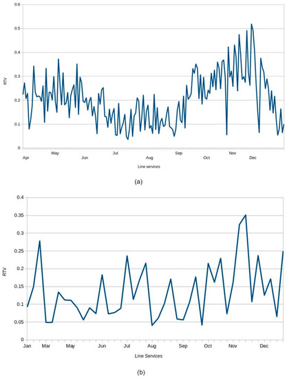 Figure 11 shows the RTV value for each type of line service. Graph (a) shows the values for weekday services (Monday to Friday). Graph (b) shows the values obtained for Sundays. Comparing the figures, it may be seen that punctuality varies according to the day type: the line service is less punctual on weekdays than it is on Sundays. The explanation for this is that there is less traffic on Sunday and there is lower demand at that time, so the buses run more smoothly and quickly, and are thus more punctual. We may also note that during the months of July and August, the weekday services are more punctual than during the rest of the year, possibly because those months are typically during the main holiday period, so there is less traffic and lower demand.