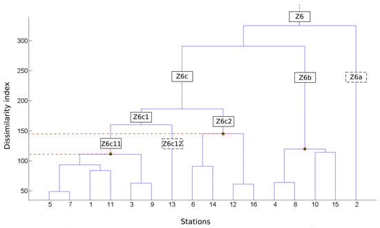 Diagram of the hierarchical ascendant classification for zone 6. Red dots indicate the dissimilarity values of the hydroclimatic groups conserved. Black squares in solid lines are the names of the areas at different hierarchical levels. Dotted black squares are classes with only one rain gauge, which are therefore unusable.