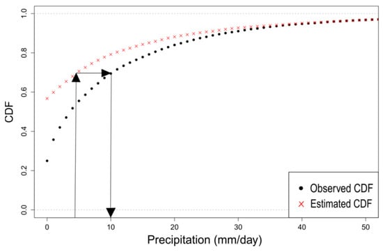 Schematic of the Quantile Mapping method. The distribution function of the SPP data is shifted to the distribution function of the rain gauge data.