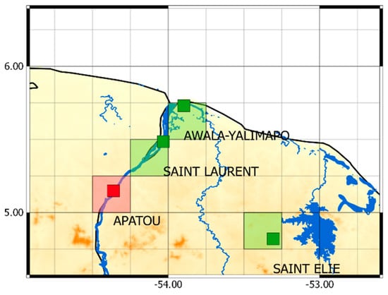 The Guiana Plateau, also called the Guiana Shield, is a region in South America located north of the Amazon River and east of the Orinoco River. This area is over 2 million km2. It spans six countries: Colombia, Venezuela, Guyana, Suriname, French Guiana, and northern Brazil (Amapá, Roraima, and Pará). The Guiana Shield has poor soil, an extensive river system, and dense primary rainforest [53]. This area accounts for 13% of the surface of the South American continent. In this study, the area considered lies within 2° S–6° N, 45°–62° W (Figure 1). The Guiana Shield is a region with high spatial variability in precipitation [11,54]. The annual average difference in precipitation between the littoral zone and inland areas can reach 2300 mm/year [11]. It is an area subject to intense and local convective precipitation. The network of precipitation measurements is very sparse and located primarily on the coast and along the rivers. Most of the present population lives on the coast or along the rivers and thus, is highly vulnerable to flooding.