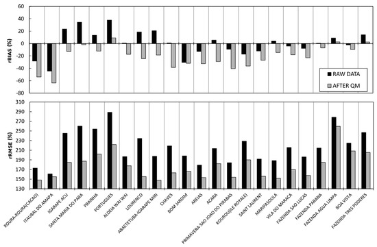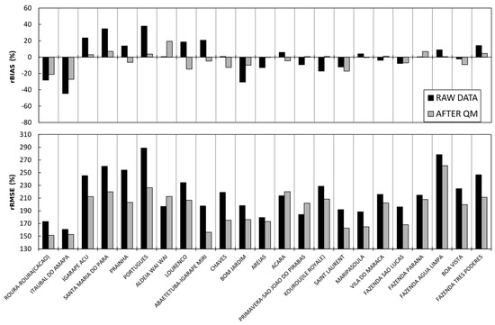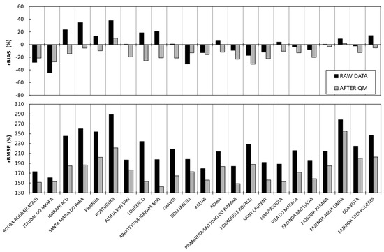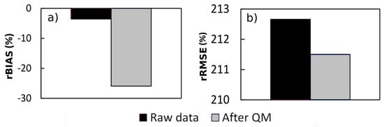 Figure 6 shows the rBIASs and rRMSEs for the 23 validation daily SPP series considered individually. The rBIASs and rRMSEs are obtained after comparing the precipitation estimated from TRMM-TMPA 3B42V7 and daily rain gauge measurements (black), and the precipitation corrected with the QM method and daily rain gauge measurements (grey).