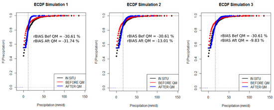 Empirical Cumulative Distribution Function for a rain gauge and its associated pixel under the three simulations. Each simulation shows the ECDF of the daily rain gauge (black), the ECDF of SPP before QM (red) and the ECDF of SPP after QM (blue).