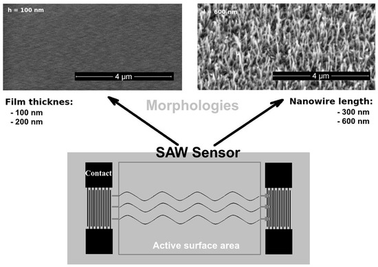 The pulsed laser deposition (PLD) technique was used to deposit 100- and 200-nm-thick crystalline ZnO thin films on the SAW sensor active surface area. Furthermore, 300- and 600-nm-long ZnO single-crystal nanowires (diameter: 20–40 nm) were grown on the active surface area using PLD in a plasma reflection plume filtering configuration [20] and vapor–liquid–solid (VLS) techniques, respectively [21] (Figure 1). Details regarding nanowire growth parameters and nanowire-based sensor fabrication techniques are reported elsewhere [15,22,23,24].