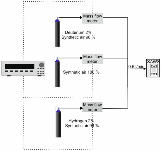 Figure 2 shows the gas concentration measurement setup, consisting of three gas cylinders: two containing deuterium and hydrogen at a concentration of 2% in synthetic air and one containing synthetic air. The gas concentration was controlled using an MKS controller connected to three mass-flow meters, one for each cylinder. The flow rate was maintained constant at 0.5 L/min, regardless of the hydrogen (isotope) concentration.