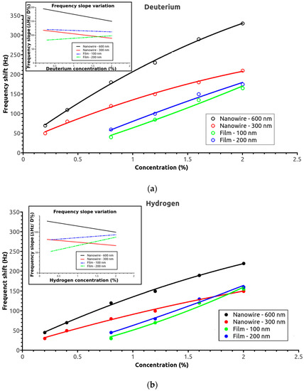 Frequency shifts of the sensors as a function of (a) deuterium concentration (inset: variation in frequency shift slope as a function of deuterium concentration) and (b) hydrogen concentration (inset: variation in frequency shift slope as a function of hydrogen concentration).