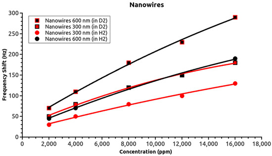 Figure 4 shows the frequency shifts of the nanowire-based SAW sensors for both isotopes. The shorter nanowire sensor response for deuterium overlapped with the longer nanowire sensor response for hydrogen. Thus, considering the proportionality of the frequency shift with the absorbed gas mass, the 1:2 surface ratio of the active layers, and the 2:1 ratio of the gas atomic mass, the overlap of the two curves confirmed the reliability of the obtained data. The thin-film sensor data also supported this conclusion; however, the overlap of the thin film curves is less relevant due to the smaller frequency shift with changing hydrogen isotope.
