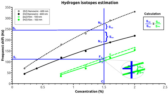 Thus, if the ND and NH points are assigned to linear (D and H) calibration curves (for the thin-film sensor according to Equation (9)), FD and FH points are assigned to the saturated variations curves (for the nanowire sensor according to Equation (8)), and a proportional relationship is assumed between the measured SF and SN frequency shifts and the reference curves (NX and FX) points for the two isotopes (according to Equation (11)). The hydrogen and deuterium concentrations in the ambient gas can then be readily calculated (both analytically and numerically).