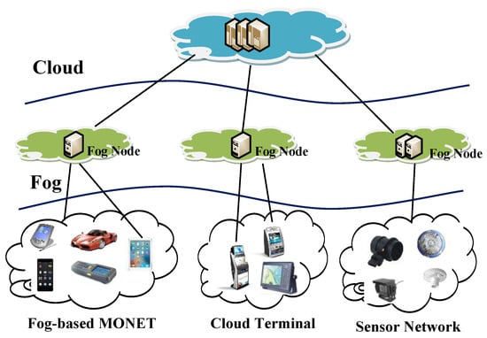 Generally, MANET is called a mobile Ad hoc network, which is composed of many organizing mobile nodes or terminals via routing protocol. What’s more, the Ad hoc On-demand Distance Vector (AODV) protocol is just a typical routing protocol. Different from the clustered network, the mobile or fixed node can autonomously connect with the fog node, or construct a self-organizing, wireless, multi-hop, peer-to-peer, and dynamic mobile network, in which each node can act as a source node, a forwarding node, or a sink node. Each node is mobile, and can communicate with the single-hop node directly with wireless transmission technology. Then, its neighbor nodes decide how to transfer the data to the next hop, repeating this until reaching the fog node.