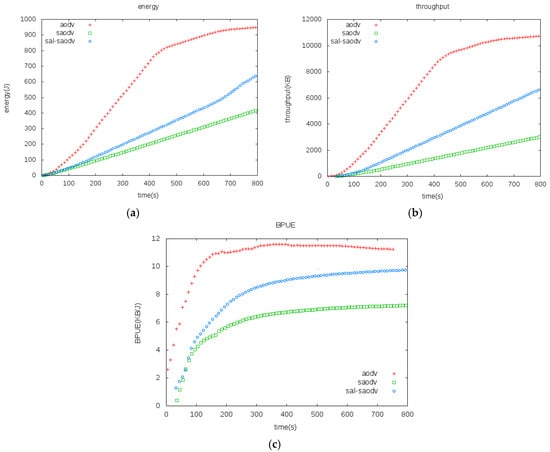 The BPUE of the three kinds of protocol is compared in Figure 5c. It can be seen from the diagram that the AODV protocol has the biggest BPUE, while SAODV displays the minimum; the BPUE of SAL-SAODV is between that of the AODV and SAODV protocol. It can be seen from Figure 5c that the BPUE metric is about 55% higher than that of the SAODV protocol when it remains steady. Figure 5a confirmed our viewpoint that the SAL-SAODV protocol improves the energy efficiency of SAODV.