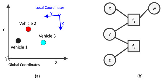 (a) Problem description with three vehicles. The local coordinate system is of the infrastructure sensor; (b) Factor graph with variables and functions and .