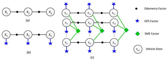 (a) Factor graph for a single vehicle with 3 state nodes and 2 odometry factors; (b) Factor graph for a single vehicle with 3 state nodes, 2 odometry factors and 3 GPS factors; (c) Factor graph for n vehicles with 3 state nodes each, 6 odometry factors, 9 GPS factors and 3 symmetric measurement equation (SME) factors.