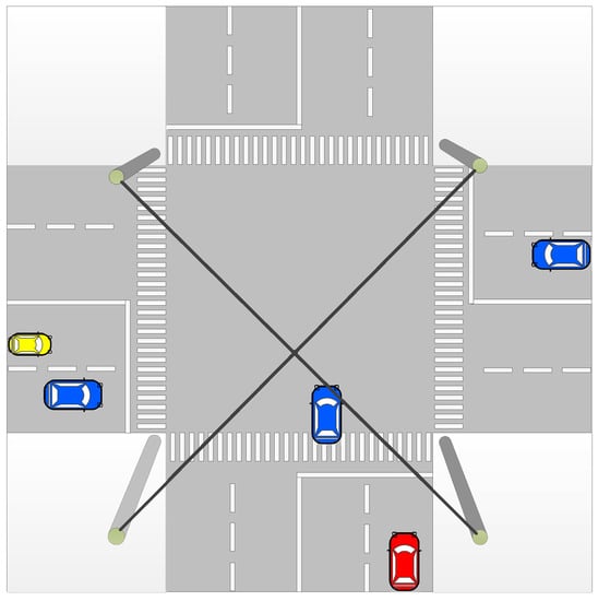 Figure 3. Simulation scenario of an intersection with five vehicles. The simulated RADAR is mounted above the ground (represented with four poles) on the cross section. The RADAR is assumed to have field of view. The vehicles represent the state of their trajectory at random time t. - Monte Carlo simulations for 1000 iterations for 2, 3 and 4 vehicles. This test also reflects the trajectories with a constant velocity model.