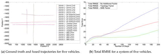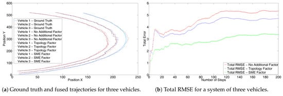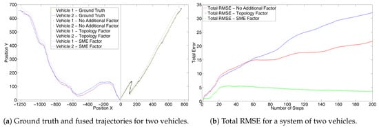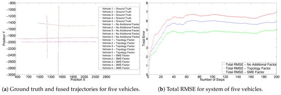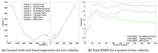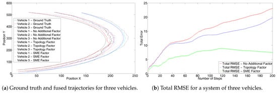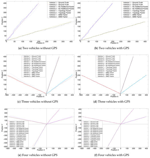 Figure 10a–f shows one set of trajectories of the 1000 iterations performed as part of Monte Carlo simulation. It can be observed that the trajectories with an SME factor for 2-, 3- and 4-vehicle systems are closer to the ground truth than the other two. Table 1 shows clear reduction of RMSE error in localization with an addition of the SME factor. However, it also highlights an anomaly for the two-vehicle system, when the SME factor without GPS performs a little better than the one with GPS. However, the difference is very small and rest of the results show considerable improvements with the GPS factor.