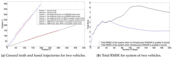 Figure 11a shows the trajectories of the two vehicles. For the case when the tunnel does not have a RADAR sensor, and hence no SME factor, we can see the fused trajectories of the vehicles drift farther from the ground truth after they enter the tunnel. However, when the tunnel is equipped with the infrastructure RADAR and the SME factor is added as the constraint between the trajectories when the vehicle is inside the tunnel, the fused trajectories remain closer to the ground truth. The trajectory resulting from the SME factor is shown in the red color. For the scenarios with and without the RADAR, the first and last 50 steps have odometry and GPS as factors. Inside the tunnel, without the RADAR, only odometry factors are added to the graph. However, with RADAR, odometry and SME factors are added in the graph. This additional information in form of the SME factor helps in convergence to the true position.