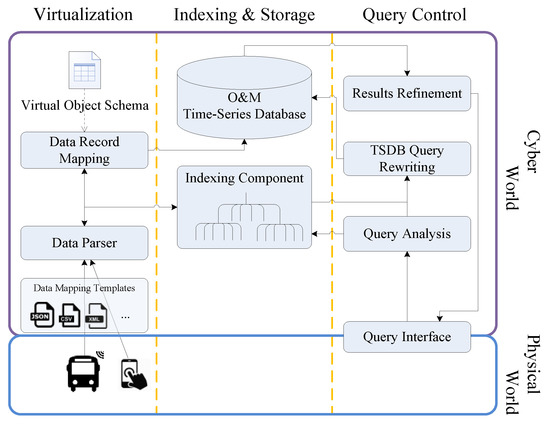 Figure 1 shows a schematic representation of the functional blocks in the framework and their sub-components: (1) a virtualization component to control the data processing flow that parses the incoming data to extract the various features and feeds the extracted location values to the indexing component. It also maps the parsed data according to a virtual object schema, along with the geohash value generated by the Indexing component, to generate a data record to be stored in the time-series database; (2) an indexing component that enables efficient search based on spatial properties and returns the IDs of the selected VOs during query processing; (3) an Observation and Measurement (O&M) Time-Series Database (TSDB) to store the sensing data; (4) a query flow control component to analyse query features, distribute features to indexing component, rewrite the query to retrieve data from the TSDB, and refine the returned results from TSDB; (5) a query interface for interacting with users: specifying query parameters and presenting results.