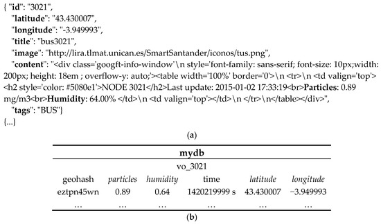 The framework supports FUTS data retrieval from a variety of data sources, which expose the data through Web interfaces. In our work, it collects data from mobile sensing objects in physical world (blue box), parses, processes, and manages the data in the cyber world (purple box). Since the schemas adopted by different sources may differ, a plug-and-play approach is adopted, with adaptors for extracting the data from heterogeneous sources. The adaptors utilize different scripts in various formats, e.g., JSON, CSV, XML etc., to parse the data. Our experience with sensor data streams (e.g., JSON data for SmartSantander and the Hypercat catalogue [27], CSV for London Air Quality Network [28] and a recent survey [29] on available sensor data streams for urban areas) shows the prevalence of these three representation formats. Figure 2 shows an example of the JSON data retrieved from the SmartSantander testbed and the resulting data record stored in the TSDB (the corresponding mapping template employs the gson (https://github.com/google/gson) deserialization library to convert JSON into Java objects).
