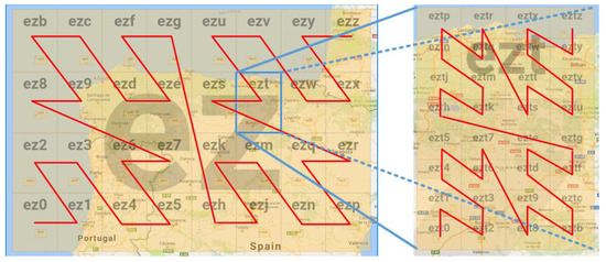 Z-order Filling Curve to Show Geohash Division. Maps are generated by using the Geohash Explorer service [31].